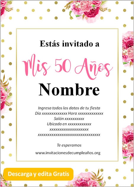 [+25] Invitaciones de Cumpleaños de 50 AÑOS para editar GRATIS, Crea online tu invitación para imprimir, enviar por Whatsapp, Facebook +