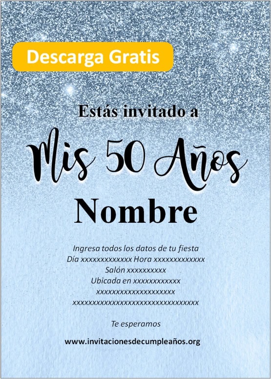 Nuestras plantillas de invitaciones de cumpleaños de cincuenta años gratuitas están en formato pdf, Solo tienes que elegir el diseño dentro de nuestro listado modificar e imprimir, para modificar las invitaciones de cumpleaños no necesitas experiencia solo tener el programa adobe reader el cual es gratuito el cual tienes muchas opciones simples para modificar la invitación.