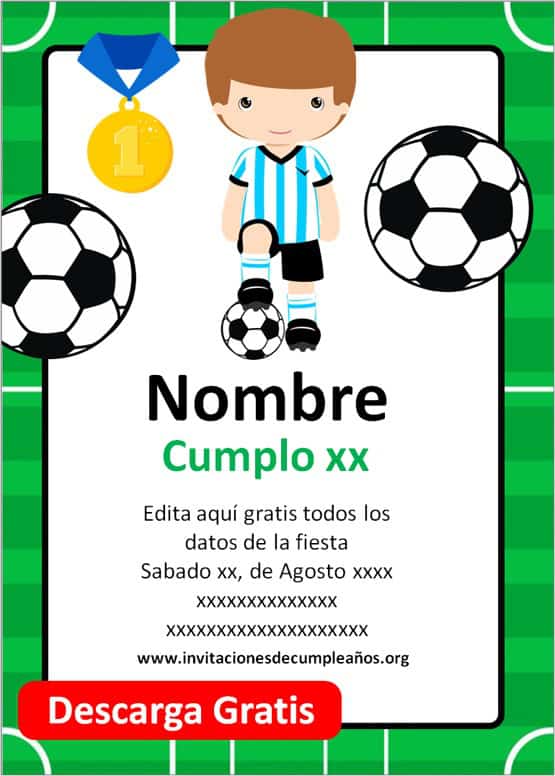 Tarjetas de Fútbol de cumpleaños para niño gratis para editar, personalizar, imprimir con excelente resolución de imagen, Podes crear y armar online tu propia invitación de cumpleaños con texto personalizado.